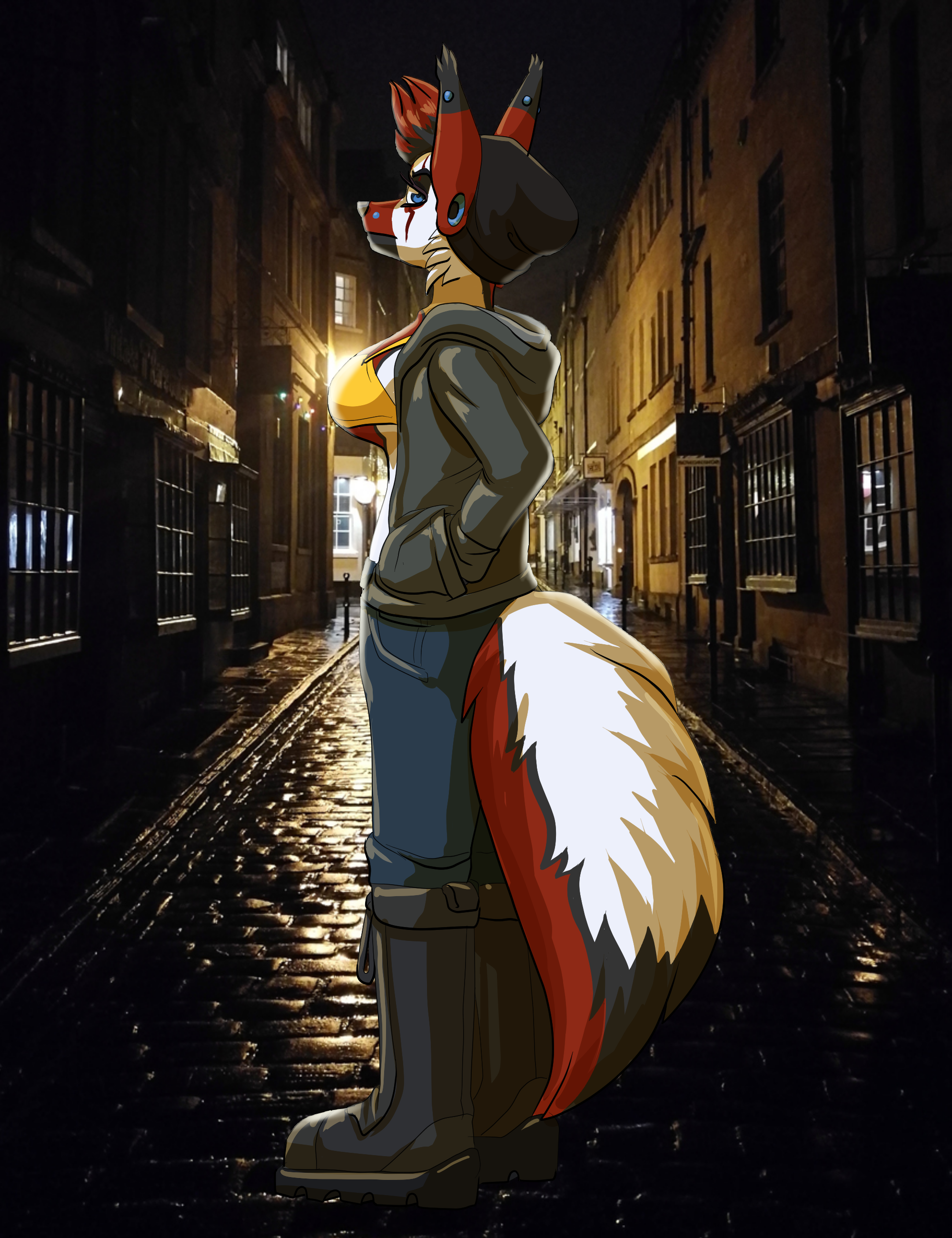 Ash standing out on a late night in a dark and wet street.