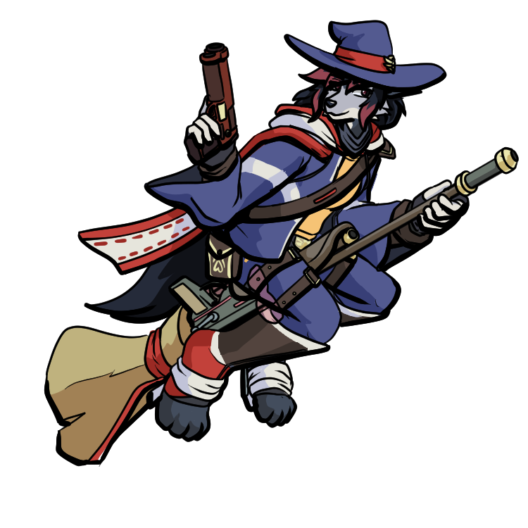 Zeydaan riding on her boomstick in her hawkmoths gear, wielding a gun.