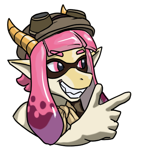 Isabella partially turned into an Inkling Girl, pointing with a smirk