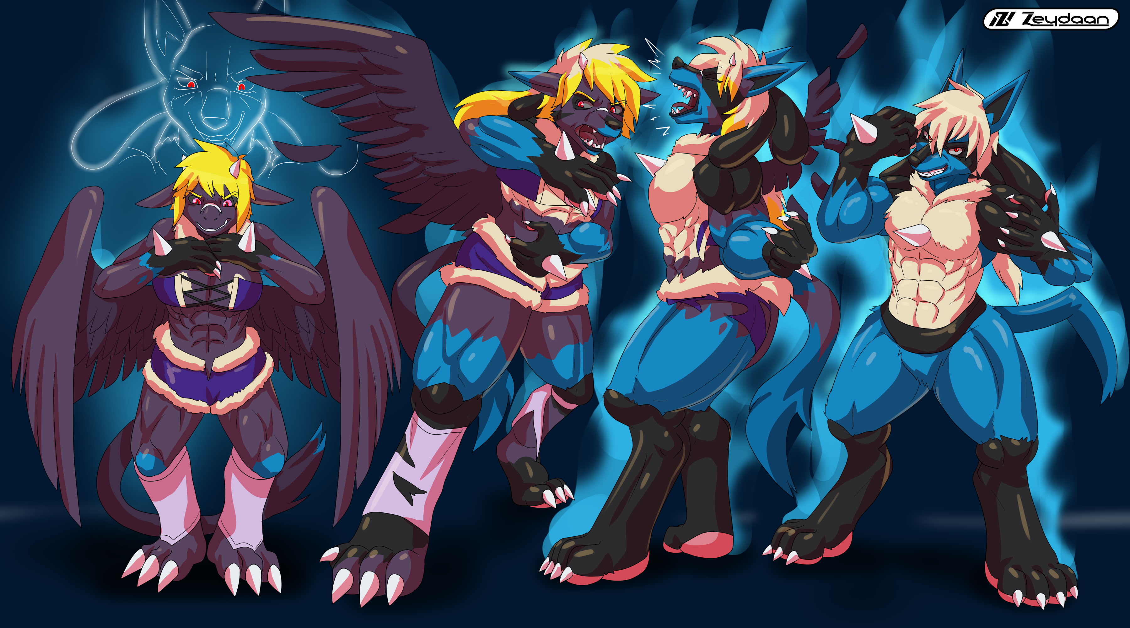 Lus the dragon possessed by a great Lucario spirit, turning into their aura-rich avatar, full of power and muscle.