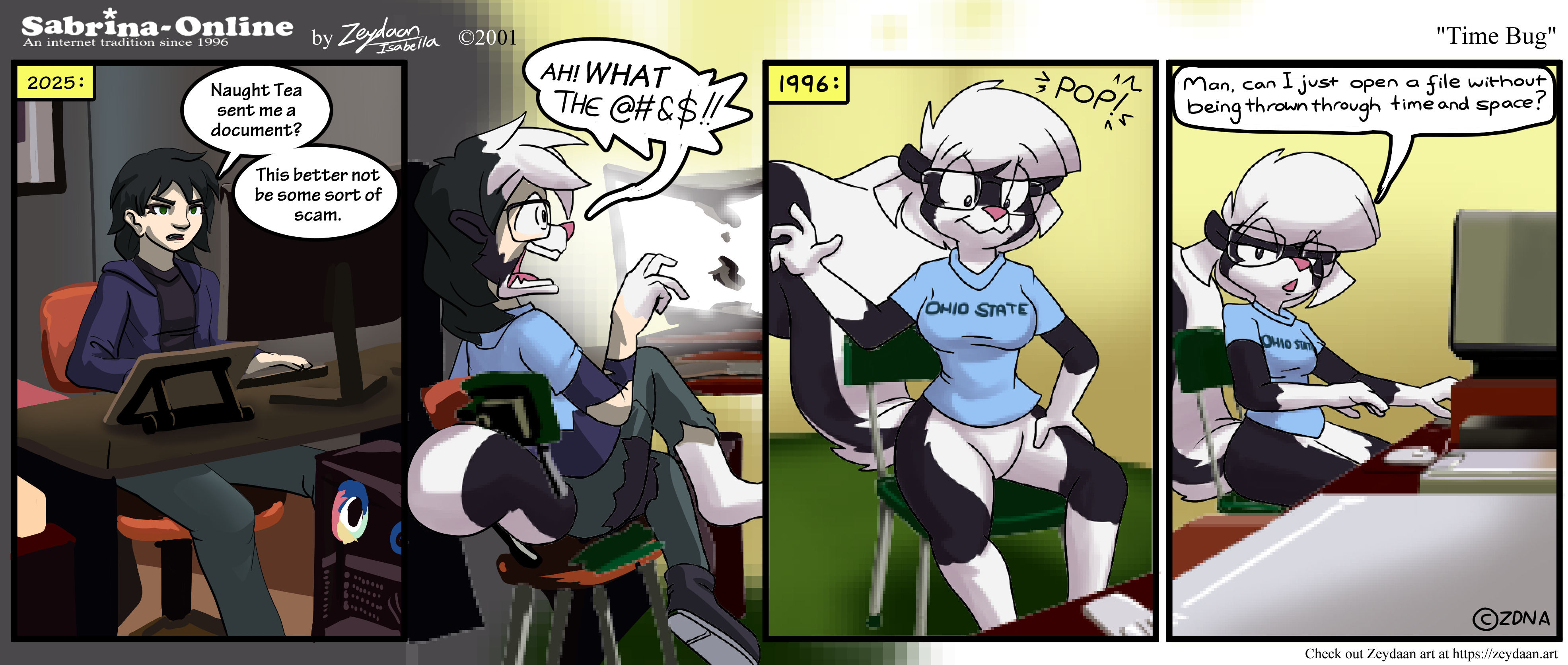 Based on Sabrina Online. Mio getting a strange document from Naught Tea. Only to find themselves blasted back in time with considerable gusto and new found coding talent.