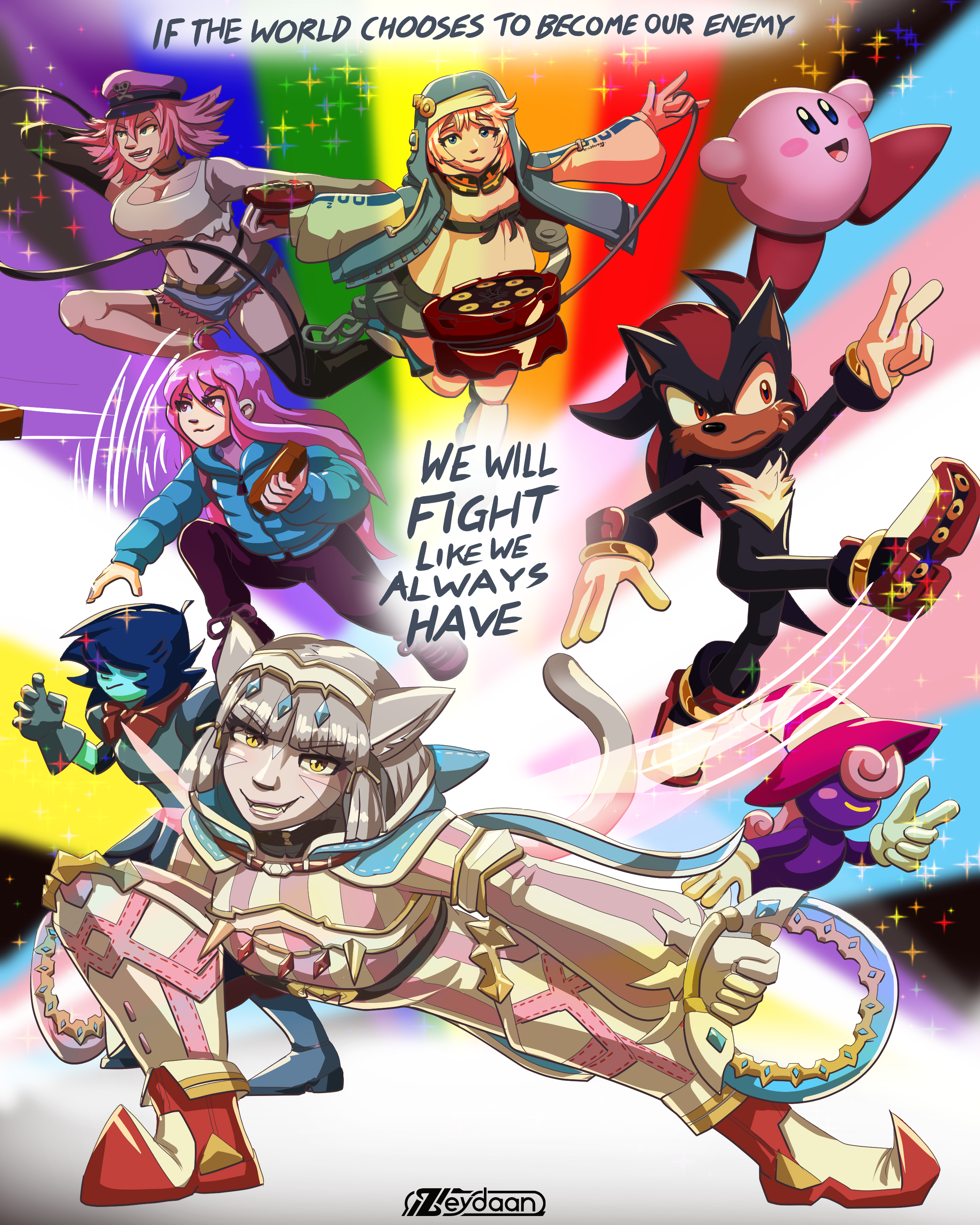 Featuring Nia herself in her trans-flag coloured outfit, Kris from deltarune, (Ch 7) Madeline from Celeste, Poison from Street Fighter, BrisketBiscuitBucketBenedictcumberbatchBaguetteBourguignonBridget from Guilty Gear, Kirby, Shadow the Hedgehog and Vivian from Paper Mario, all of them fighting together.