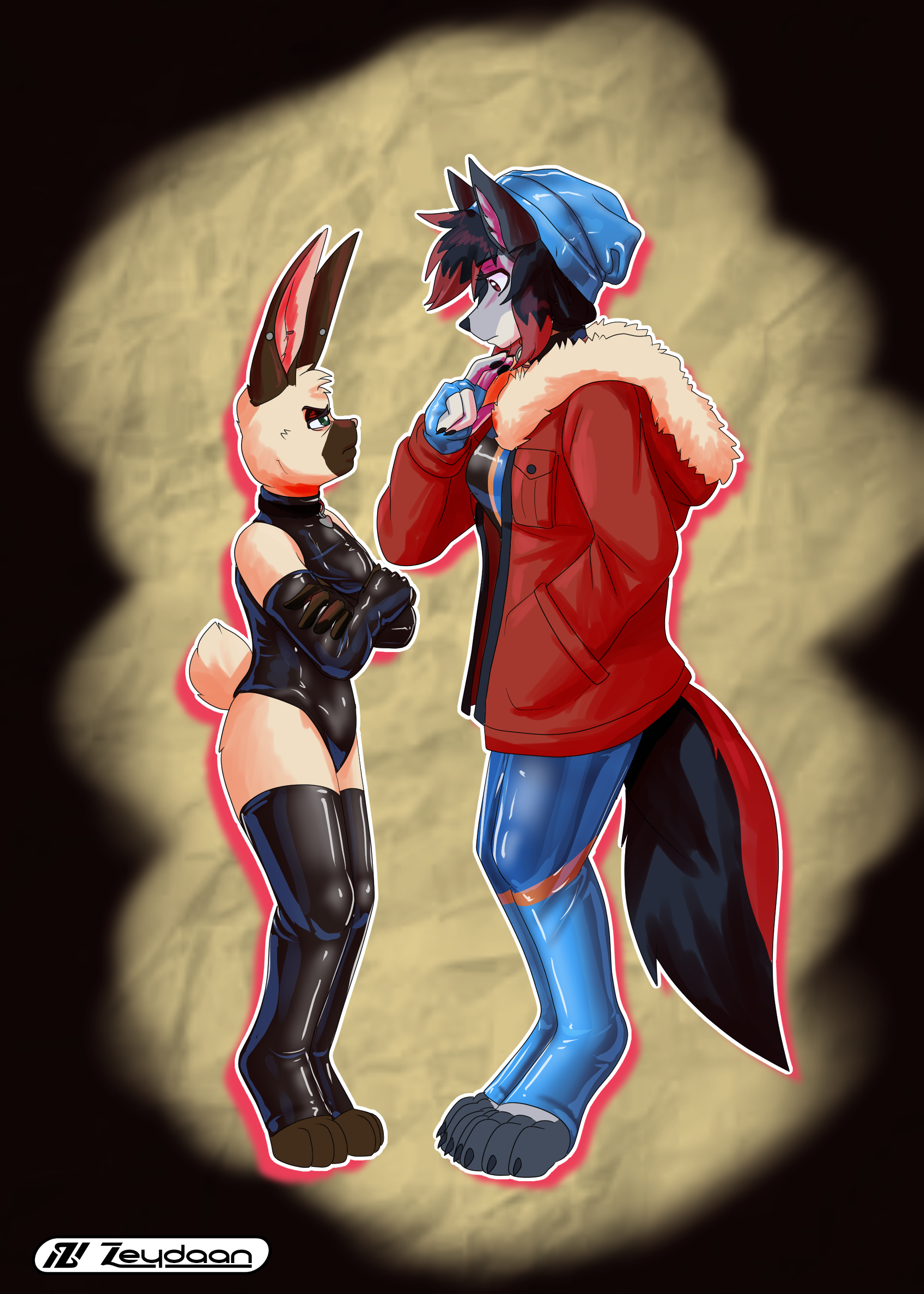 Zeydaan's spent a lot of time with Yuki and Tyroski, but hasn't met the new blood yet. Wearing a fun shiny outfit out for the day, Zey would finally meet the rabbit with a harsh glare.