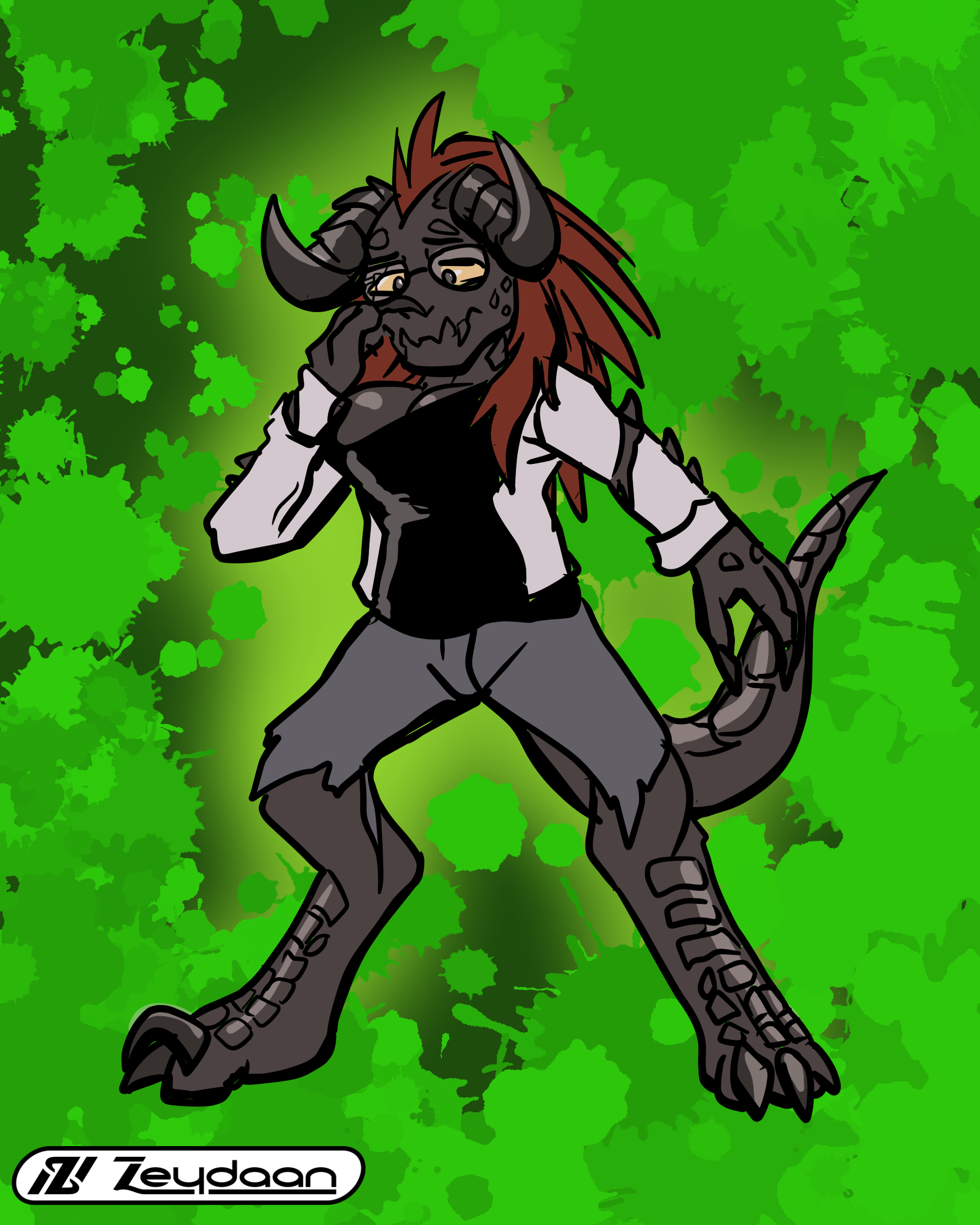 A post TF of Mattae, a deathclaw-like lizardfolk after getting a hefty dose of mutagenic radiation. Their old human clothes aren't exactly going to be up to snuff of managing their new 'assets'.