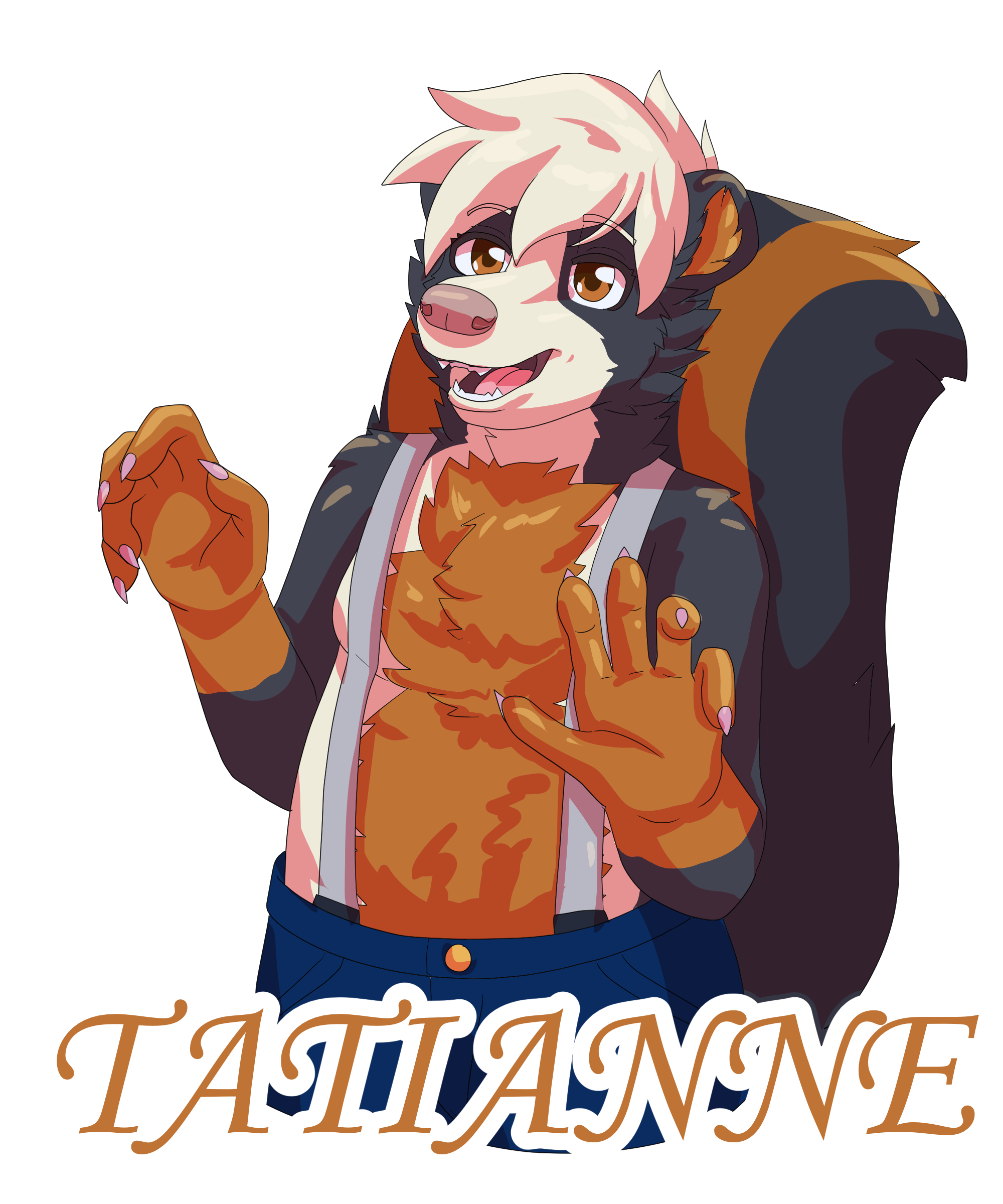 One half of a reversible fursuit badge of Tatianne the Skunk. Here wearing suspenders and a cheeky smile.