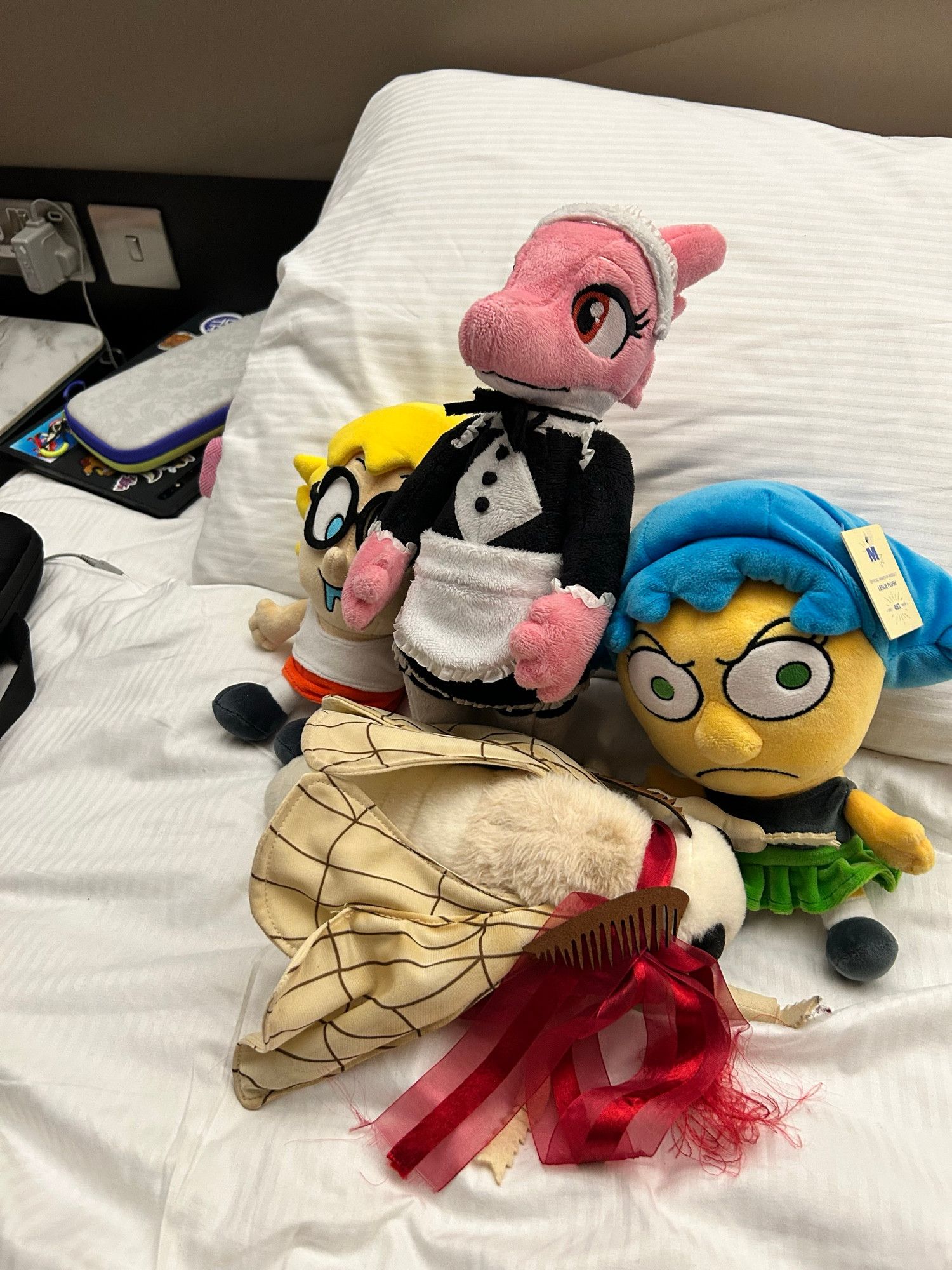 Collection of plushies, including Bean, Charlotte, Leslie and Brianne