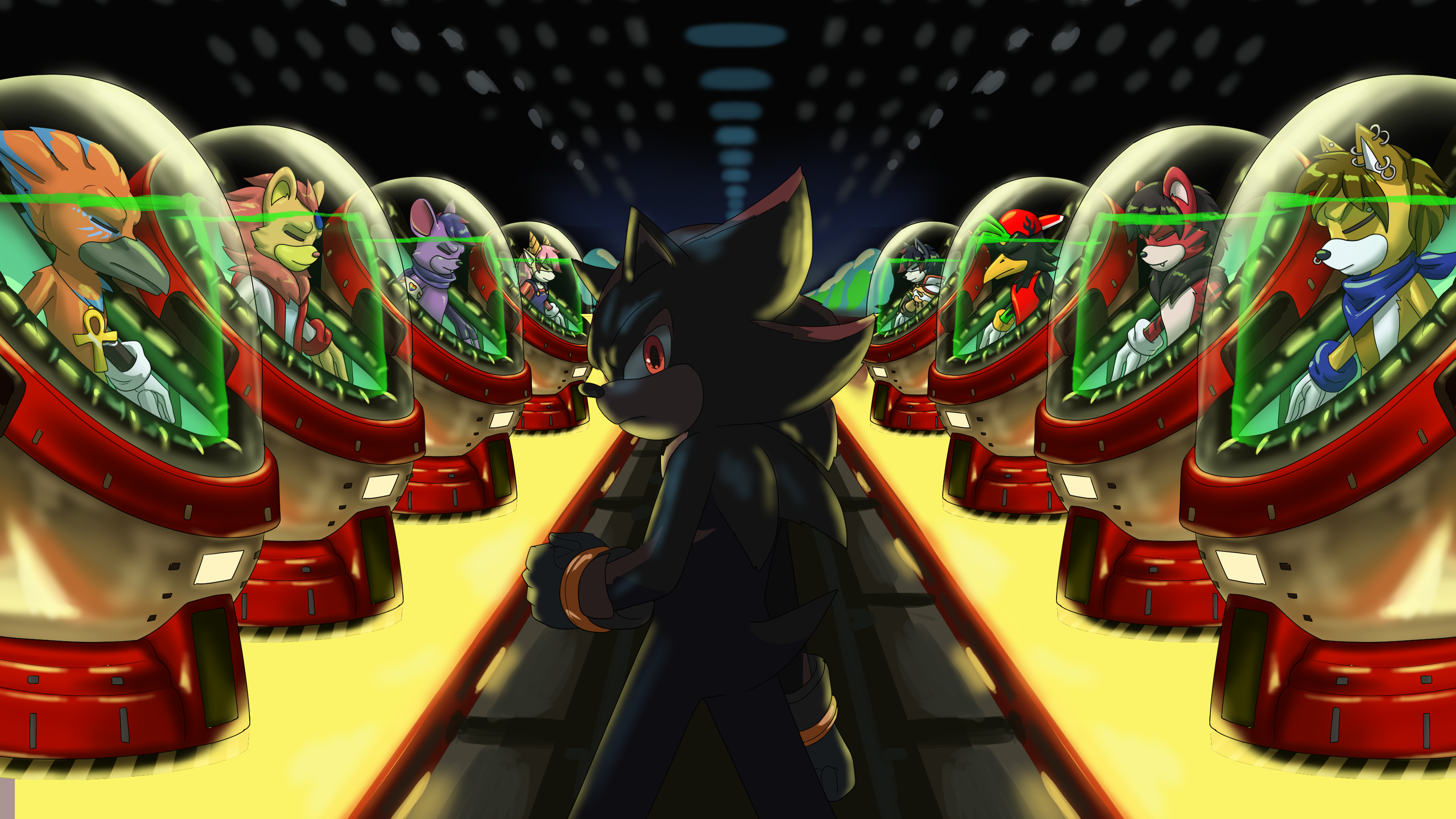 Regdeh, Reivan, Lucius, Zeydaan and Isabella, Envy, Fiyah and Damian Tanuki in the Sky Rail eggman chambers, alongside Shadow the Hedgehog. This is for an AWESOME medley they made, which can be seen here.