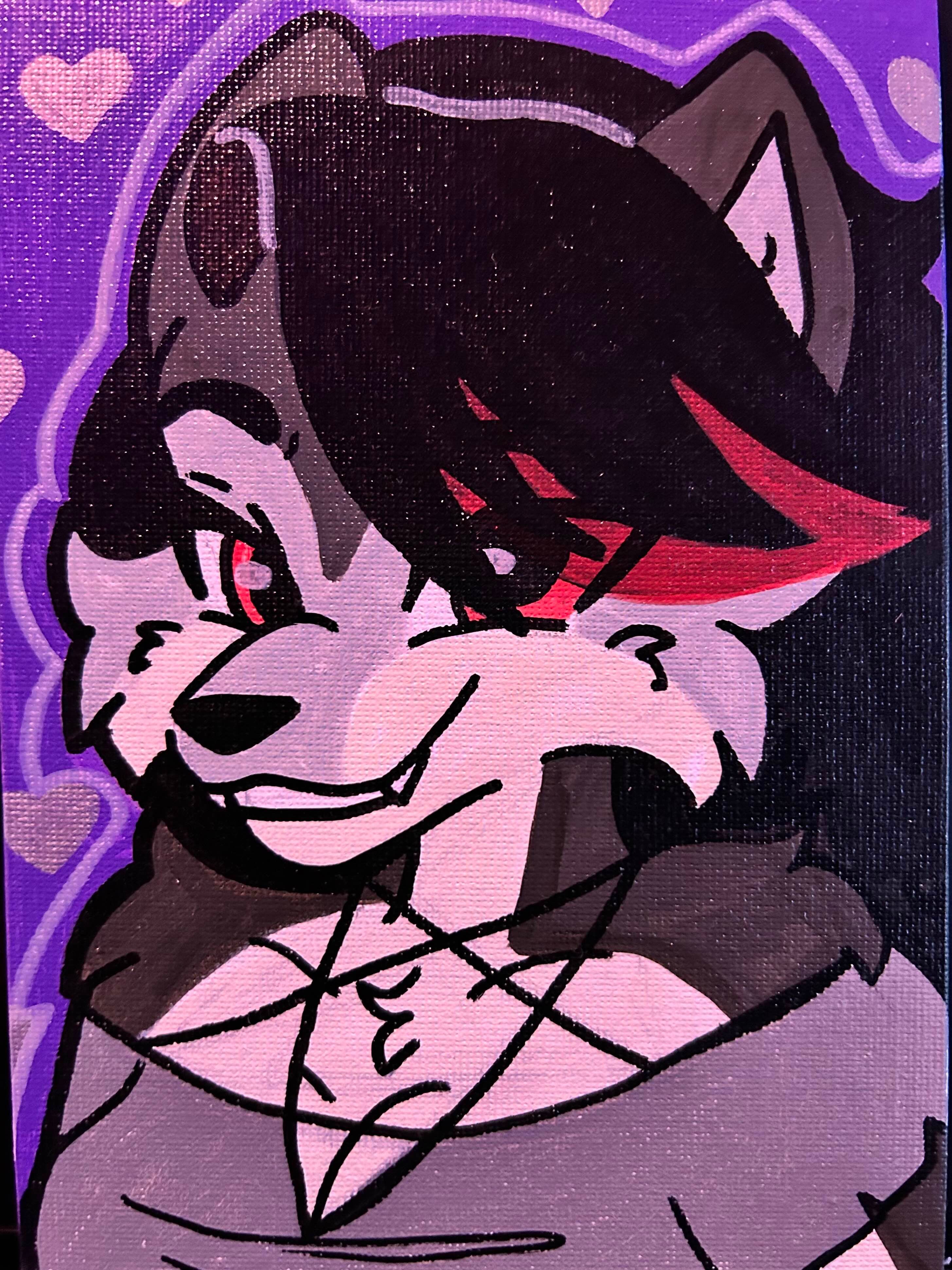 A physical painting of Zeydaan as a hellhound, wearing Loona's outfit in the process.